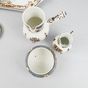 GIEN, fin XIXE : service à chocolat égoïste en faïence fine blanche à riche décor grotesque bleu et or à la Bérain de rinceaux, sphynges et putti comprenant 1 petit plateau (L. 32.5 cm), 1 chocolatière à manche latéral tripode (H. 14 cm), 1 sucrier couvert (H. 12 cm), 1 crémier tripode (H. 10 cm), 1 tasse et sa sous-tasse. Marque de 1866 - 1875. Petites égrenures sous les becs, petit éclat sous le col de la tasse. TBE de fraicheur.