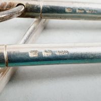 S.F.A.M, fin du XIXe-début du XXe siècle : suite de 7 brochettes à viande en métal argenté uni à prise annulaire mobile dans le style des hâtelets utilisés au XVIIIe siècle. Signés. L. 19 cm. Rayures.