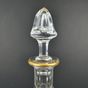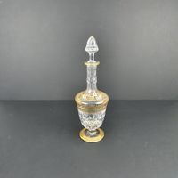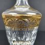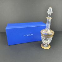 SAINT-LOUIS, STELLA, Période contemporaine : carafe à vin en cristal et frises or de rinceaux feuillagés, le pied circulaire étoilé, le corps tulipe à facettes lancéolées, le col à pans et facettes lancéolées, bouchon tulipe à pans. Cachet. H. 36.8 cm. micro-rayures. TBE, quasi-neuf. + boite bleue de la maison et notice.
