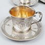 Suite de la fin du XIXe siècle de 6 tasses à café en argent 950 mil. à différentes variantes de décors pastillés et ciselés de rinceaux, volutes, frises, cartouches feuillagés ou médaillons monogrammés PP en lettres anglaises. Minerve 1er titre de 1838 et poinçons de Maître sur 4 tasses et 4 soucoupes d’Ernest BUNET (actif 1855-1886) (une tasse anse manquante). Déformations d’usage. Poids : 446.1 g. Diam des soucoupes : 10.3 cm sauf une 9 cm. H. des tasses au col : 4.8 cm.