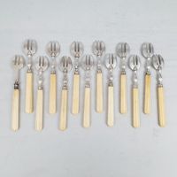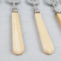VAN KEMPEN, Hollande, années 1840 : Suite de 12 fourchettes à huîtres en argent uni 833 mil. les manches jaunes moulurés et tachés. Poinçons hollandais 1814-1906. En l’état. Poids brut : 239.2 g. L. 14.8 cm. (Poids d’argent du fourchon décollé : 9.5 g). Exemptées art 524 bis al. b du CGI. On y joint une fourchette à huître, d’un modèle similaire, de Hippolyte THOMAS de la même période. Minerve 1er titre. Poids brut : 18.8 g. L. 14.9 cm. Poids brut total : 258 g.