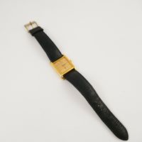 Montre sur bracelet d’homme Ernest BOREL en or 750 mil, boîtier rectangulaire (34 x 24 mm), cadran doré à index bâtons peints et pastilles appliquées, cadran secondaire pour les secondes, mouvement mécanique, travail français des années 1960. Bracelet en cuir et boucle en métal rapportés usés (longueur totale : 22,3 cm) (cadran légèrement piqué). 31,3 g. brut
