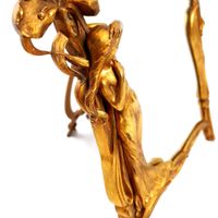 Blanche POCCARD DE SANTILAU (act.c.1900) Miroir de toilette en bronze doré à décor sinueux de fleurs et d’un personnage féminin, avec chevalet et anneau de suspension au dos. Signé sur le côté. Epoque Art Nouveau. Dimensions : 36 x 25 cm.