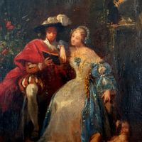 Ecole française du XIXème siècle « Couple galant » Huile sur toile monogrammée en bas à gauche et daté 1845. Dimensions : 19,5 x 16 cm. (Manques, salissures).