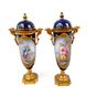 SEVRES (Dans le goût de) Deux vases miniatures couverts en porcelaine polychrome à décor en pendant de scènes galantes en réserve sur fond bleu nuit, monture en bronze et laiton doré. Marque apocryphe dans le couvercle. Hauteurs : 15,5 cm.