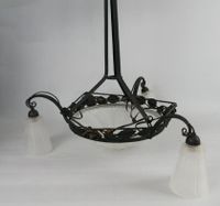 VERRERIE DES HANOTS - Lustre à armature en fer forgé martelé à motifs floraux et feuillagés, retenant 3 tulipes cache-ampoules et une vasque en verre blanc pressé-moulé satiné mat à décor géométrique, gradins, ainsi que fleurs et fruits stylisés. Vasque signée en relief « DES HANOTS ». Travail des années 1930. Diamètre vasque : 35cm ; Hauteur tulipes : 14,5cm ; Hauteur totale : 88cm environ. (Eclats et salissures).