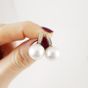 Paire de boucles d’oreilles en or gris 750 mil. serties chacune d’une ligne de diamants brillantés retenant en pampille une importante perle de culture d’eau douce (hauteur : 2,2 cm environ) (diamètre perles : 14,4 mm environ). 8,7 g. brut