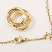 Collier en or 750 mil à maillons forçat signé CARTIER (Long : 44 cm), Pendentif trinity en or 750 mil, un anneau rehaussé de pierres fines signé CARTIER (Diam : 1,7 cm). 8,2 g brut.