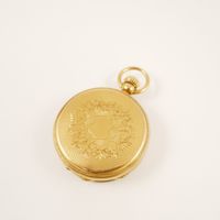 Montre de col en or 750 mil, cadran émaillé blanc à chiffres romains et arabes, mouvement mécanique, dos ciselé et guilloché. (Poinçon Tête de Cheval, départements, 1838-1919). (Diamètre : 36 mm environ) (chocs). 43,2 g. brut.