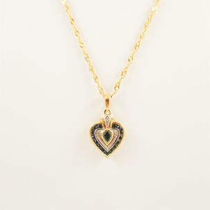 180 / 240 €Pendentif « Cœur » deux ors 750 mil. serti de saphirs et ponctué de diamants 8/8. (Hauteur : 1,9 cm), et Collier maille torsadée en or 750 mil. (Longueur : 44,5 cm). 5,9 g.