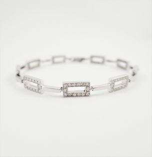 500 / 600 €Bracelet à maille alternée en or gris 750 mil. à maillons rectangulaires ajourés sertis de diamants brillantés, fermoir cliquet. (Longueur : 20 cm environ). (Largeur maillons : 6,5 mm). 14,7 g. brut