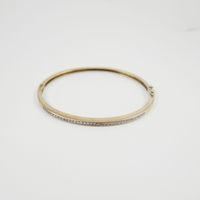 Bracelet jonc ouvrant en or gris rhodié 750 mil. serti d’une ligne de diamants brillantés, fermoir cliquet avec huit de sécurité. (Diamètre : 6,5 mm). (Tour de poignet : 17 cm). (Déformations, fermoir défectueux). 10,4 g. brut