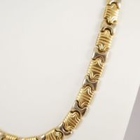 Collier deux ors 750 mil. à maillons parenthèses, fermoir cliquet avec huit de sécurité. (Longueur : 45 cm ; Largeur : 0,8 cm). 36,2 g.