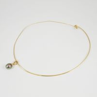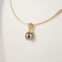 Collier semi-rigide en or 750 mil. à maille oméga (longueur : 42 cm) (déformations) et Pendentif deux ors 750 mil. retenant une perle de culture grise (diamètre : 9 mm) rehaussé de diamants 8/8. (hauteur : 1,8 cm). Travail français. 7,3 g. brut