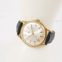 Montre sur bracelet cuir usagé, boîiter rond en métal doré (Diam : 34 mm), cadran argenté à index bâton, LIP, mouvement mécanique (verre rayé, remontoir usé rapporté).