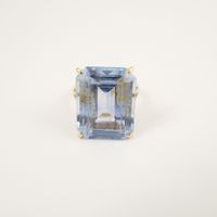 Bague en or 750 mil sertie d’une pierre imitation bleue rectangulaire à pans coupés (18 x 14 mm), travail français. (TDD : 57 environ) (déformation, égrisures et petits manques de matière). 7,5 g. brut
