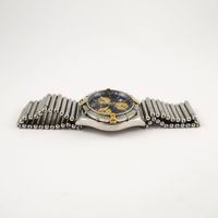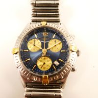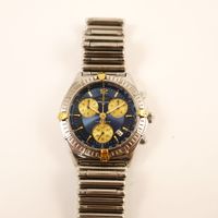 Bracelet-montre d’homme BREITLING chronographe en acier, boitier rond, lunette tournantes à cavaliers en métal doré, cadran bleu à index appliqués, 3 cadrans secondaires, guichet dateur à 4H30, mouvement à quartz, bracelet en caier articulé à boucle déployante papillon. Signé et numéroté. (Tour de bras : 20 cm environ). Sans écrin, ni papiers.