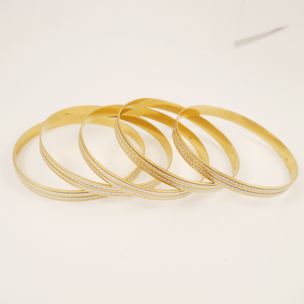 2 900 / 3 400 €5 Bracelets joncs 2 ors 750 mil. à décor guilloché (diamètre : 7 cm environ) (longueur : 21 cm environ) (largeur : 0,7 cm environ). 96,1 g.