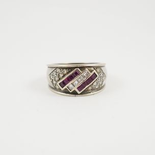 400 / 500 €Bague bandeau en or gris 750 mil. centrée d'un décor géométrique composé de 3 rangs de diamants et rubis calibrés dans un pavage de diamants brillantés, travail français (TDD : 61) (largeur : 1,1 cm environ) (égrisures sur rubis, très léger fêle à la monture). 9,4 g. brut