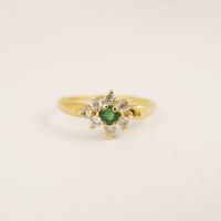Bague en or 750 mil. centrée d’une émeraude ronde dans un entourage de pierres imitation (TDD : 53) (manque pierre, égrisures, déformation). 1,8 g. brut