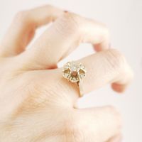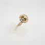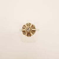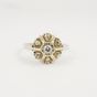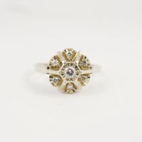 Bague fleur en or gris 585 mil. centrée d’un diamant brillanté de 0,10 carat environ dans un entourage de diamant 8/8, travail français (TDD : 60) (diamètre : 1,2 cm environ). 4,4 g. brut