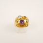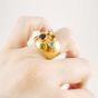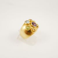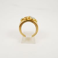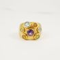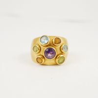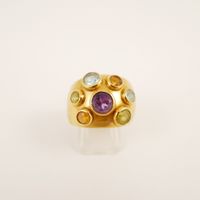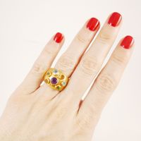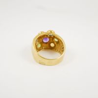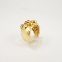 Large bague jonc en or 750 mil. ornée de pierres fines rondes en sertis clos, travail français (TDD : 56) (largeur : 1,6 cm environ) (égrisures). 12,6 g. brut