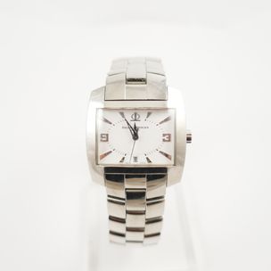 200 / 300 €Bracelet-montre BAUME & MERCIER « Hampton Spirit » en acier, boîtier convexe de forme coussin, cadran blanc à index et chiffres arabes, guichet dateur à 6H, mouvement quartz, sur bracelet en acier articulé à boucle déployante papillon signée. Signé et numéroté. (Dimensions boîtier : 32 x 32 mm). (Tour de poignet : 16,5 cm). (Avec écrin et carte d'identification).