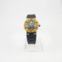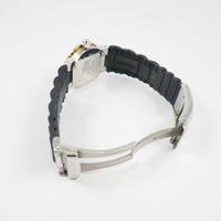 Bracelet-montre CHAUMET « Class One » en acier, boîtier rond, lunette crantée en or 750 mil. (exemptée Art.524bis du CGI al.c) graduée et émaillée noir, cadran noir guilloché, chiffres romains et index peints luminescents, guichet dateur à 6H, mouvement quartz, sur bracelet en caoutchouc à boucle déployante papillon en acier signée. Signé et numéroté. (Diamètre : 33 mm ; Tour de poignet : 18 cm environ). 75,3 g. brut