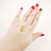 Médaille d’amour A. AUGIS « Plus qu’hier Moins que demain » en or 750 mil, à fond rayonnant, sertie d’un diamant taillé en rose et de pierres de synthèse rouges calibrées. Signée. (Diamètre : 12 mm ; Hauteur : 14 mm). (Non chiffrée). 2,3 g. brut