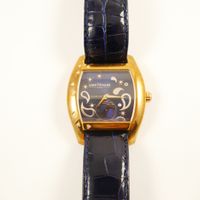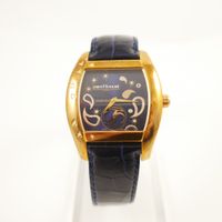 Montre-bracelet de dame SAINT HONORE « Monceau » en acier doré, boîtier de forme tonneau, cadran bleu nuit rayonnant à motif cachemire, cadran et lunette rehaussés de diamants 8/8, mouvement quartz, sur bracelet en cuir usagé bleu embossé croco à boucle ardillon en métal doré. Signée et numérotée. (Dimensions boîtier : 36 x 31 mm). (Longueur : 19 cm environ).