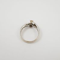 Solitaire en or gris 750 mil orné d’un diamant brillanté de 0,30 ct environ entouré et épaulé de petits diamants brillantés (TDD : 53,5) (pierre manquante). 3,9 g. brut.