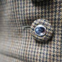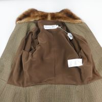 CHRISTIAN DIOR Paris. Jolie veste courte cintrée en laine motif « pied de poule » marron et gris, taille cintrée et bas du vêtement évasé. Fermeture par simple boutonnage de trois boutons Dior et un bouton pression caché. Deux fausses poches plaquées à rabat boutonné. Col rond orné de Vison. Taille 38. Largeur épaules veste : 42cm, longueur veste : 57cm environ. Doublure soie marron. Griffe blanche, graphisme noir. Bon état, pas de ceinture.