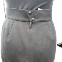 THIERRY MUGLER Paris. Elégant tailleur noir taille 38, composé :d’une veste courte cintrée en laine peigné, col rond polylobé, bas du vêtement et des manches soulignés de bandes de velours noir. Fermeture par quatre boutons pression. Largeur épaules veste : 44cm, longueur veste : 58cm environ et d’une jupe droite cintrée en laine peignée noire. Fermeture éclair, deux boutons pression et une agrafe (à refixer). Petite fente dos. Largeur jupe : 33-44-40cm, longueur jupe : 51cm environ. Griffe bleue, graphisme argenté. Bon état.