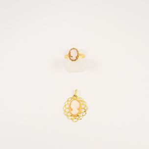 90 / 110 €Demi-parure en or 750 mil. composée d'un Pendentif et d'une Bague chacun serti d'un camée sur coquille figurant le profil d'une élégante. (TDD : 53) (Haut. Pend. : 2,1 cm). 3 g. brut