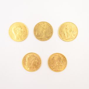 1 300 / 1 500 €5 pièces de 20 FRF en or 900 mil. (datées : 1854, 1878, 1897, 1905 et 1914). 32,2 g.