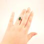 Bague en or 750 mil. et platine 950 mil. ornée d’une pierre verte imitation taille coussin dans un entourage de diamants taillés en roses. Numérotées. Travail français début XX ème. (TDD : 49). (Eclats, usures). 2,8 g. brut