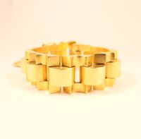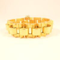 Bracelet tank en or 750 mil. à maillons articulés géométriques, orné d’une breloque retenant une pièce de 100 FRF datée de 1879 en or 900 mil., fermoir cliquet avec huit de sécurité. Travail français des années 40. (Longueur : 18,5 cm ; Largeur : 2,2 cm ; Longueur breloque 6,6 cm ; Diam. pend : 3,8 cm). (Petits chocs, accident, usures à la pièce). 87,9 g.