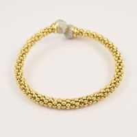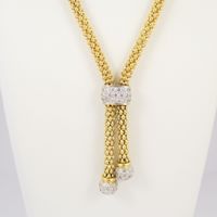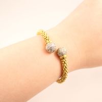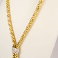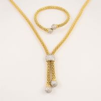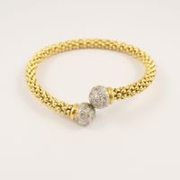 Demi-parure deux ors 750 mil. à maille orvet dont un Collier négligé et un Bracelet jonc ouvert, les extrémités ornées de sphères pavées de pierres blanches imitations. (Longueur collier : 43 cm ; Bracelet : 18 cm). 66,7 g. brut