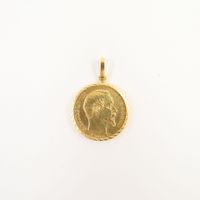 Pendentif médaillon en or 750 mil retenant une pièce de 20 FRF en or 900 mil. (datée de 1855). Travail français. 8,2 g.