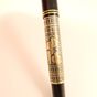 Stylo-plume PELIKAN « Toledo » habillage en résine noire et vermeil 925 mil. à décor ciselé et noirci représentant le pélican emblème de la marque, plume 2 ors 750 mil., agrafe du capuchon en métal doré. Système de remplissage à piston. Signé. (Longueur : 12,5 cm). 21,9 g. brut. (Usures, plume déformée). Dans son écrin Toledo en bois noirci et livret. [Exemptée art. 524 bis du CGI al. c].