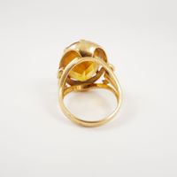 Bague en or 750 mil. à décor ajouré de volutes, ornée d’une pierre imitation jaune ovale, travail français (TDD : 55) (largeur : 2,3 cm environ) (légères égrisures). 11 g. brut