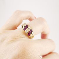 Bague en or 750 mil. sertie de rubis taille navette et de diamants brillantés (TDD : 53) (largeur : 0,8 cm environ) (égrisures importantes aux rubis, manque 2 diamants). 7,3 g. brut