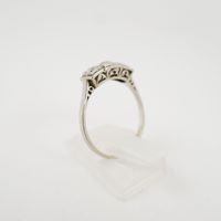 Bague jarretière en platine 850 mil. ornée de 3 diamants TA de 0,23 à 0,10 carat environ (TDD : 57) (petit fêle à la monture, trace de soudure, éclats). 2,7 g. brut