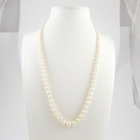 Collier de perles de culture en chute, fermoir serti de roses et chaînette de sécurité en or gris 750 mil. et platine 850 mil. (longueur : 49 cm environ) (diamètres : de 3,3 à 7,7 mm environ) (mousqueton de la chaînette défectueux). 17,3 g. brut
