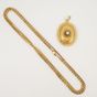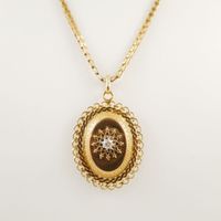 Lot en or 750 mil. composé d’un collier à maille fantaisie (longueur : 63,5 cm environ) (légères déformations) et d’un pendentif médaillon ouvrant centré d’un diamant 16/16 de 0,15 carat environ (hauteur : 4,5 cm environ) (chiffré, légères déformations). Travail français. 16,4 g. brut