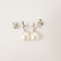 Paire de boucles d’oreilles en or gris 750 mil. chacune à décor végétal serti de 2 diamants brillantés et retenant en pampille une perle de culture en forme de poire (hauteur : 1,9) (diamètre perles : 7,5 mm environ). 2,4 g. brut