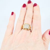 Bague en or 750 mil godronnée, à chaton carré serti de diamants TA, 16/16, et 8/8. Travail des années 40. (TDD : 57) (pierre cassée). 7,6 .g brut.