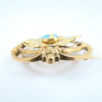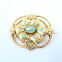 Broche ajourée en or 750 à décor émaillé. Travail du XIXème siècle. (Dimensions : 4,4 x 3,7 cm) (émail accidenté, usures, accidents, soudures). 5,6 g. brut.