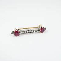 Broche barrette en or 585 mil et argent 800 mil ornée d’une chute de roses encadrées de 2 spinelles rouges (longueur : 3,2 cm) (égrisures). Travail russe de la fin du XIXème siècle. 2,8 g. brut.