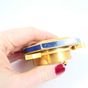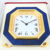 Pendulette-réveil octogonale CARTIER en métal doré et laqué façon lapis lazuli, cadran émaillé blanc à chiffres romains noirs, mouvement mécanique. Signée et numérotée. Avec son écrin et papiers. (Dimensions : 7,4 x 7,4 cm) (laque accidentée).